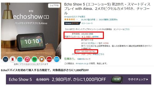 いくらなんでも安すぎる。 今回のamazonブラックフライデーセールの中で、最もお得と言っていいのではなかろうか。 それぐらい「Echo Show 5」の価格設定は衝撃だ。 Echo Show 5 (エコーショー5) 第2世代 - スマートディスプレイ with Alexa、2メガピクセル…