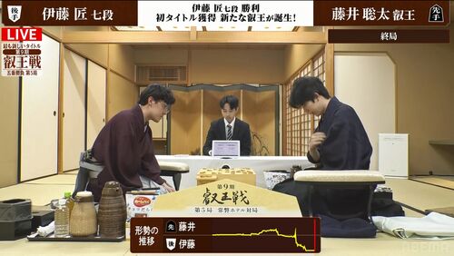 叡王戦第5戦。 ここまで両者2勝2敗。この1戦で叡王が決まる運命の対局。防衛か奪取か。 藤井叡王は、有利な先手番の権利を得て、十八番の「角換わり」戦法を採用。 同年代のチャレンジャー伊藤七段は、それを受けて堂々と戦った。 途中は、藤井叡王が勝勢に…