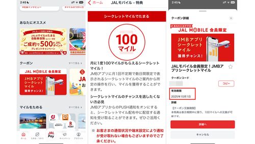 JALマイレージバンク(JMB)アプリ内に、毎月わずか数日だけ出現する「シークレットマイル」クーポン。 JALモバイルの契約者だけに付与される、素敵な特典だ。 今月は、28日になっても出てこなかったので、気を揉んでいたのだけれど、日付が29日に変わると同…