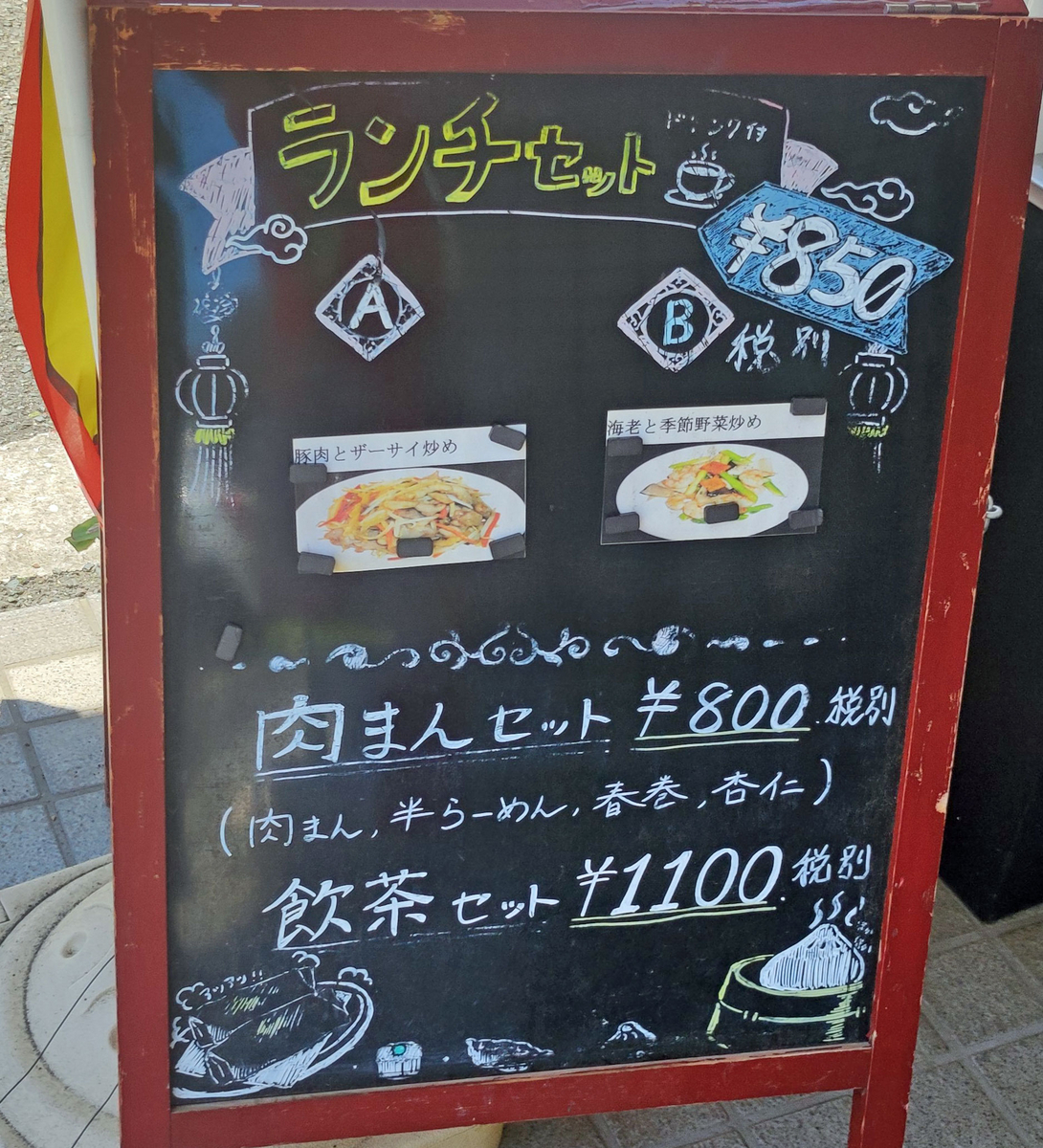 店の入口には、ランチセットの看板が立っていた。肉まんセットや飲茶セットなどもあるようだ。