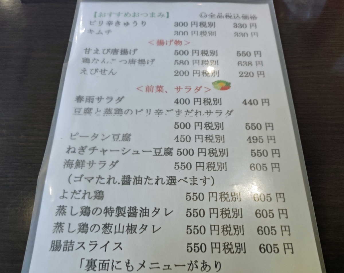 僕は、これらの中から、「キムチ」と「もやし炒め」を注文した。ともに300円だから安い。