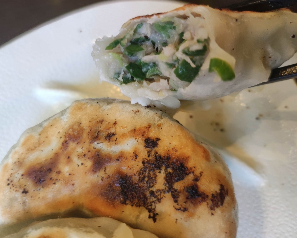 キャベツや白菜といった野菜に混じって、ニラが最も存在感を示している餃子だ。
