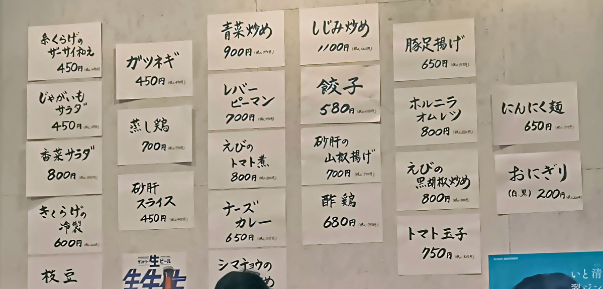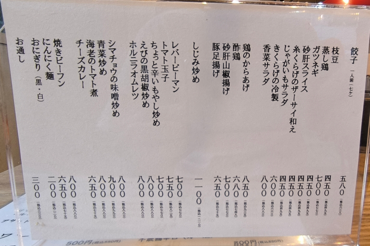 壁に貼られているモノも、カウンター上のものと同じだったので、とりあえず、餃子だけを注文。