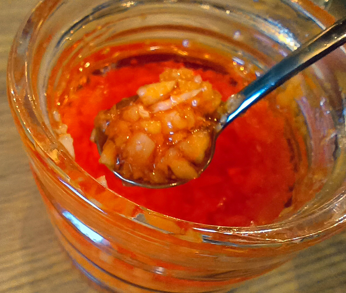 テーブル上に置いてあった自家製ラー油には、ニンニクがたっぷり。