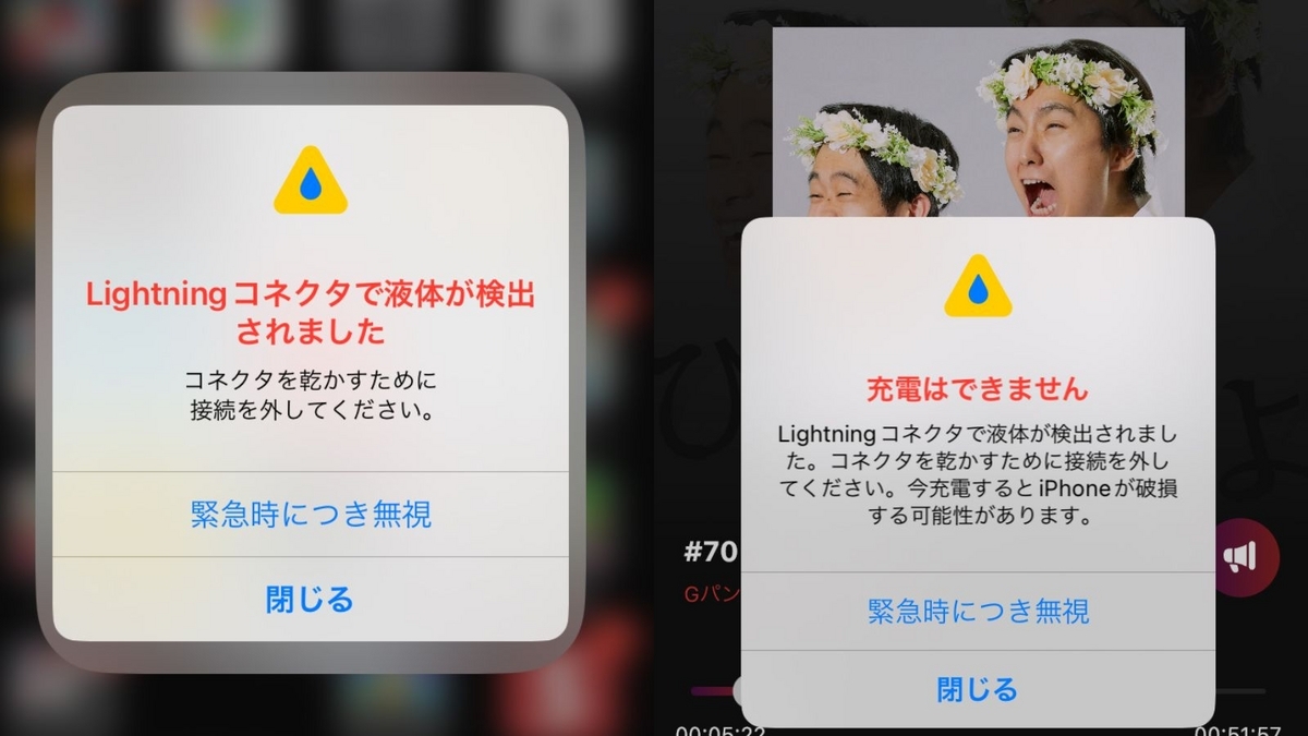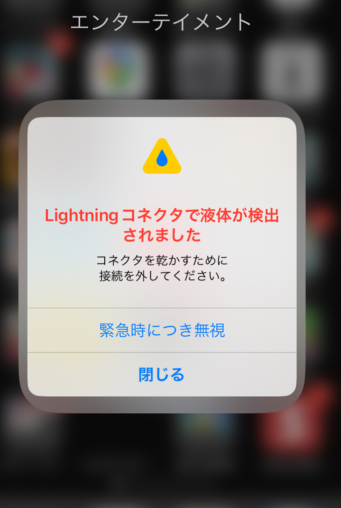 Lightningコネクタで液体が検出されました。コネクタを乾かすために接続を外してください。