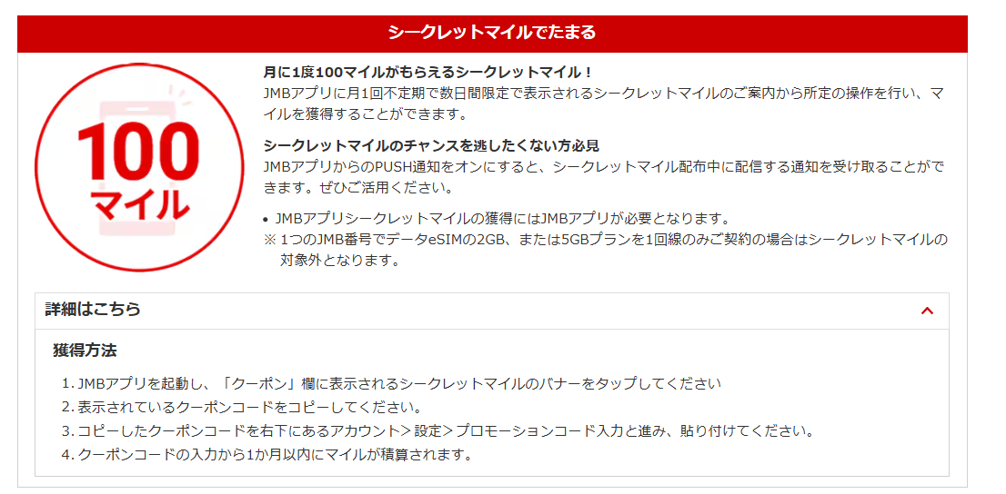「JMBアプリからのプッシュ通知をオンにすれば、シークレットマイル配布中に通知が送られてくる」ということだったので、油断して日時のチェックを止めたら…。