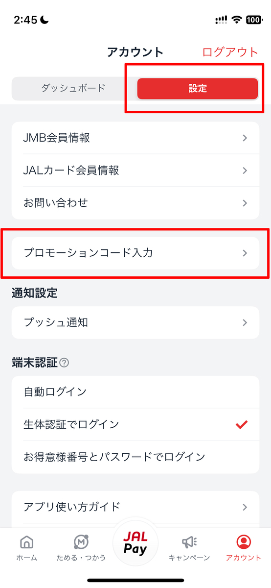 「設定」タブ→「プロモーションコード入力」をタップ。
