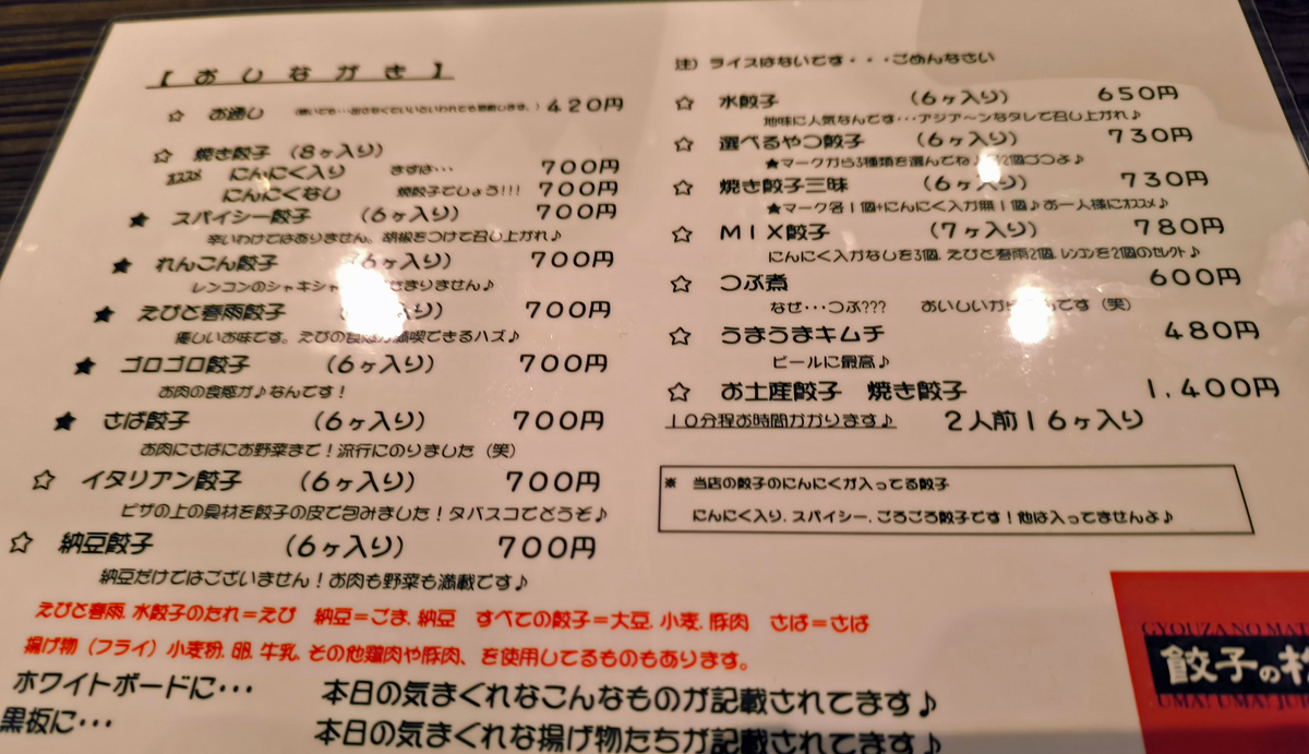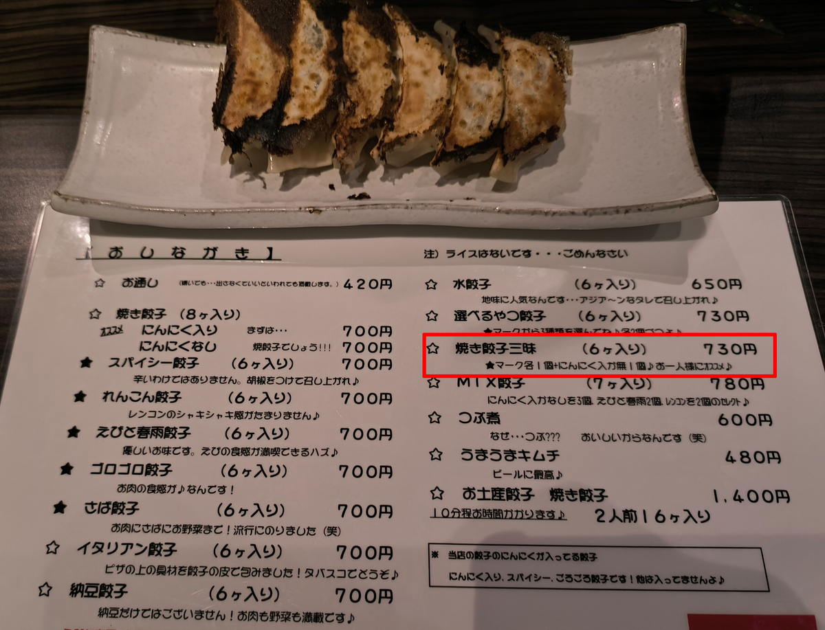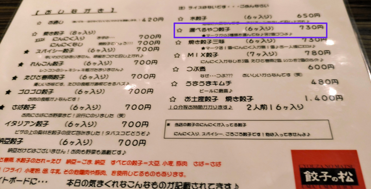 「選べるやつ餃子」として、★の中から3種類(2個づつ)を選べるメニューがあったのだ。