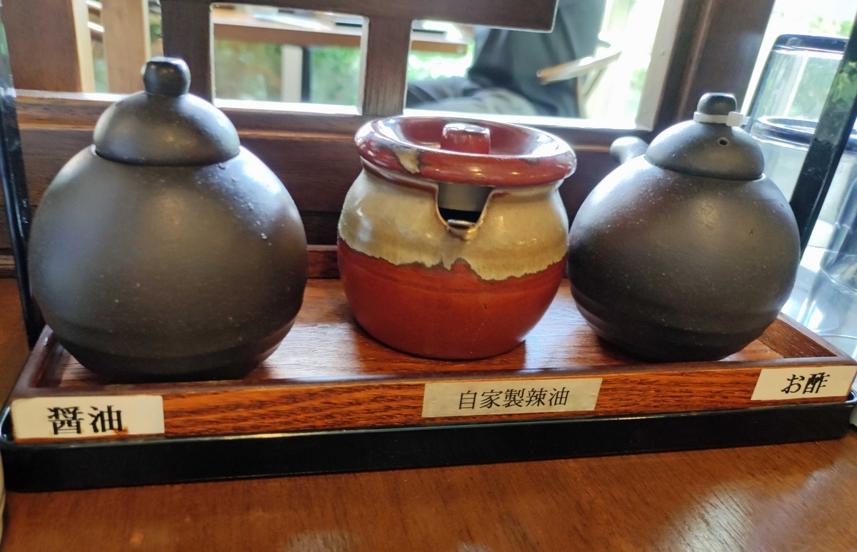 自家製辣油もあるし、醤油やお酢の容器もしっかりした造りで、悪くない。
