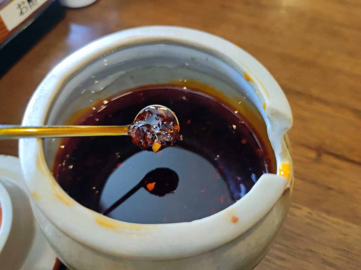 自家製辣油を確認し…。タレ用の小皿に盛り付ける。