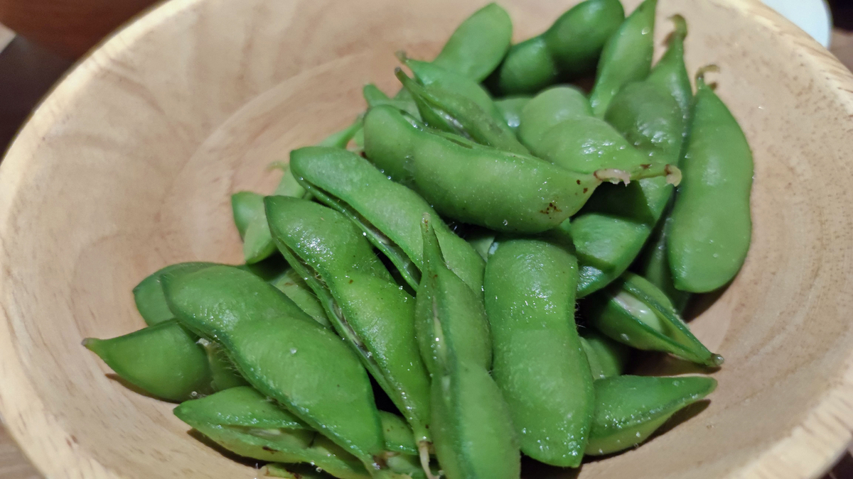 茶豆。茹でたて、熱々。塩加減も絶妙。