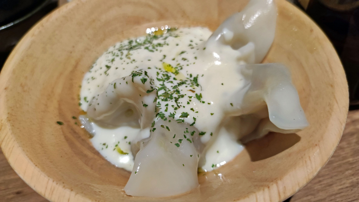 ゴルゴンゾーラチーズのソースがたっぷりかかった水餃子。これは、もう、完全にパスタ料理だ。ソースの濃厚さがたまらない。