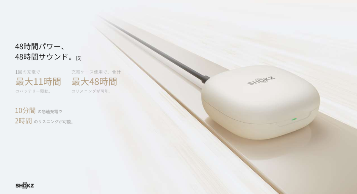 初代は7時間、OpenFit Airは6時間だったので、超絶進化と言える。
