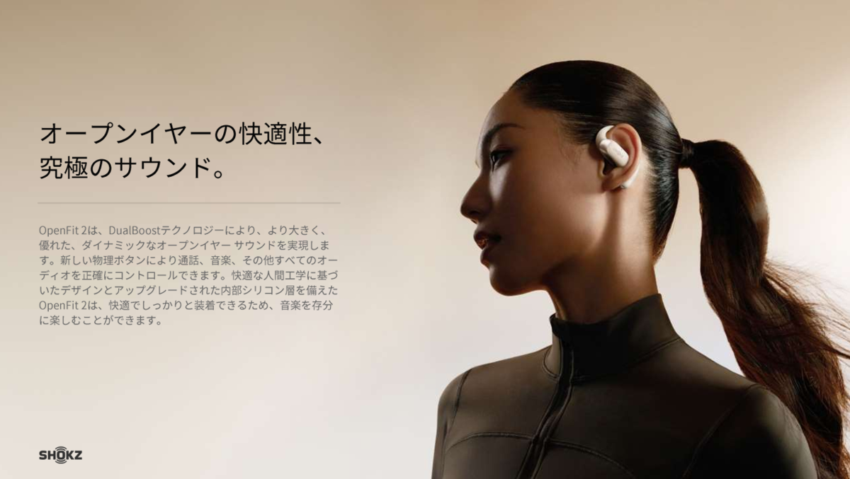 「OpenFit 2」は、左右独立タイプのワイヤレスイヤホンだから、その安定感は、首に巻き付けるタイプの「OpenRun」シリーズには及ばない。