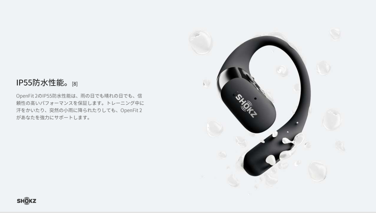 初代OpenFitやOpenFit Airは、IP54だったので、防水性能を示す一桁目の数値がひとつ向上している。素晴らしい。