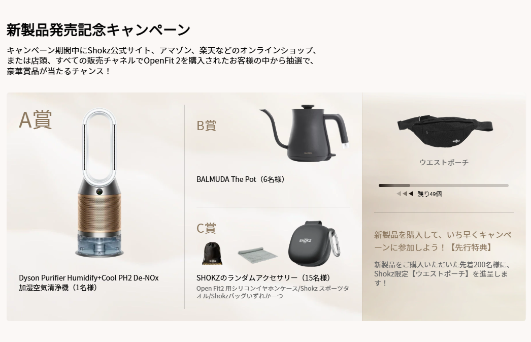 Shokzの公式オンラインストアでOpenFit 2を直接購入した場合は、上記キャンペーンに自動エントリーされる。