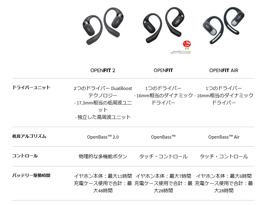 OpenFit 2の公式Webサイトには、シリーズ3商品の比較表が掲載されている。