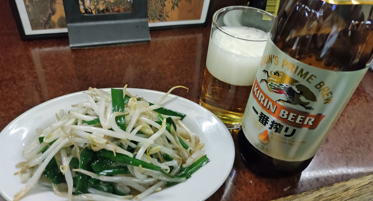 それとともに、この店の看板メニューといえる「ニラモヤシ(ニラともやし炒め)」を頼んだ。
