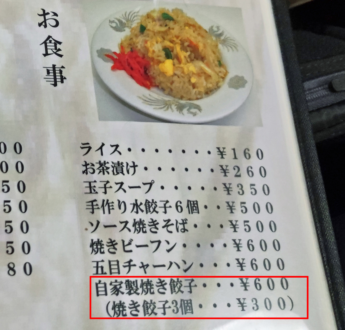 焼き餃子と同価格の600円となる料理も、焼きビーフンと五目チャーハンだけ。