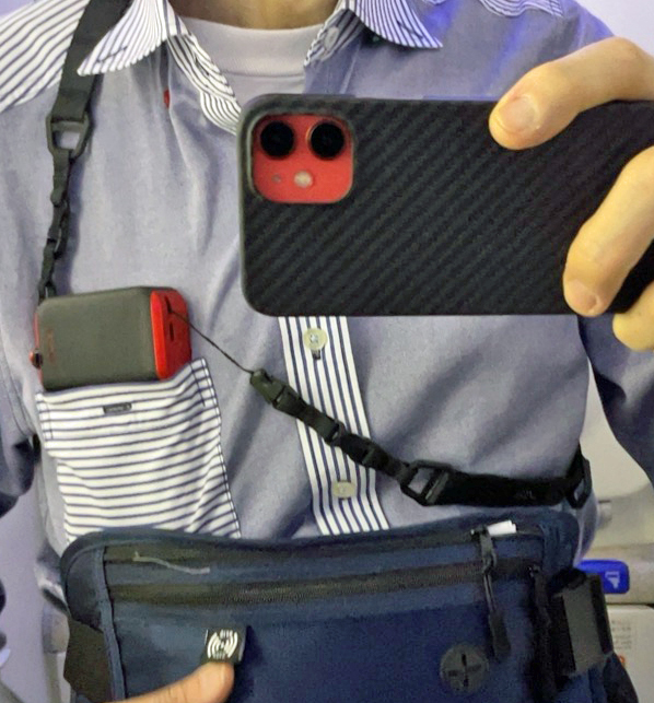 こんな感じで肩から吊るし、胸ポケットに収めることで、安心安全に写真を撮りまくることが可能。