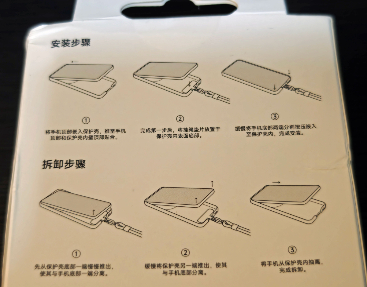 外箱の裏面に、ストラップの着脱方法が記載されていた。