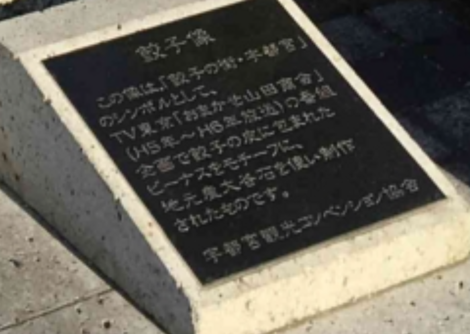 この時に撮った餃子像の説明部分を大きく拡大してみると、誕生経緯が明記されていた。