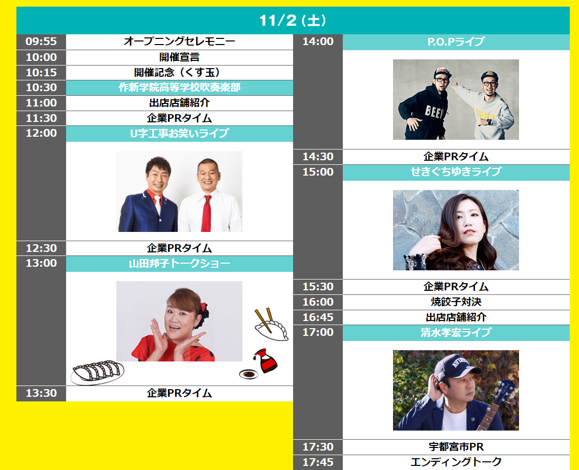 特設ステージでは、宇都宮餃子会永世伝道師でもある山田邦子さんやU字工事さんなどが登場し、会場をさらに盛り上げてくれますよ♪