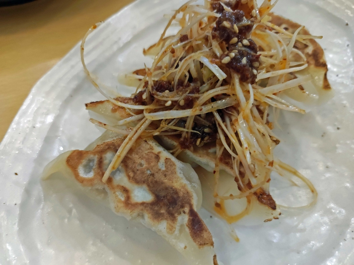 餃子の上に、長ネギのラー油和えがトッピングされたものだ。