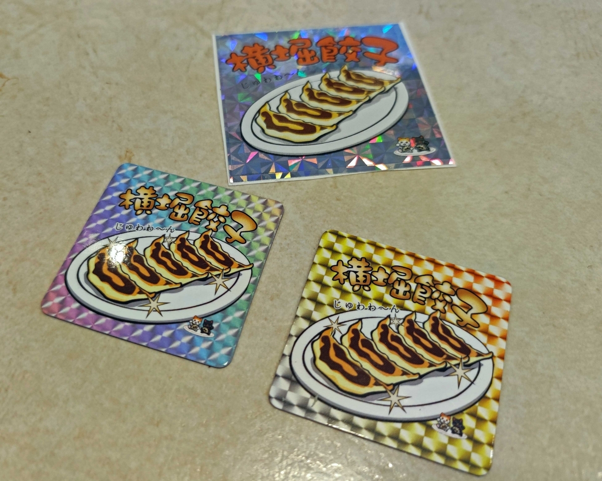 会計後、マスターからは、「横堀餃子」イラストのステッカーとマグネットシールをいただいた。