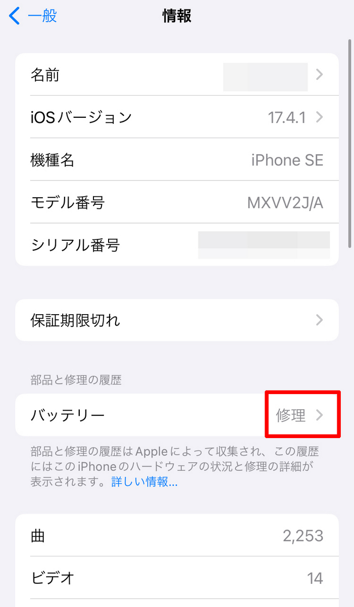 「設定」→「一般」→「情報」と進むと、このような画面になった。