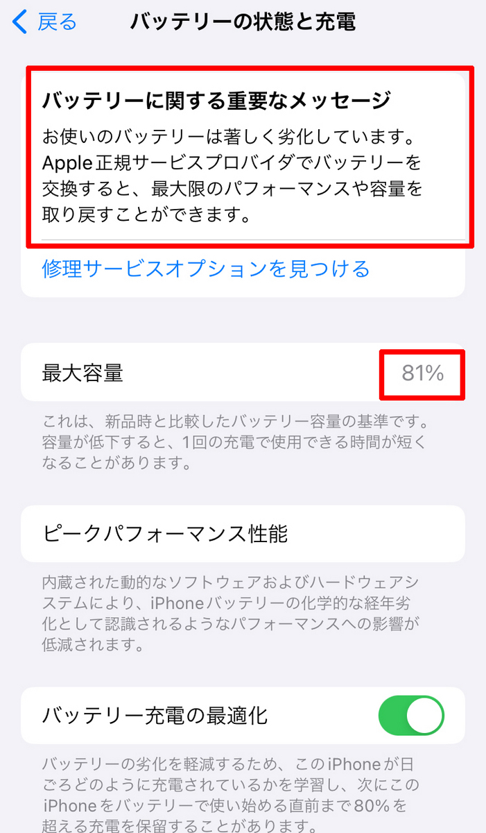 それは予想通りだったのだけれど、意外だったのは、バッテリの最大容量が81%だったこと。