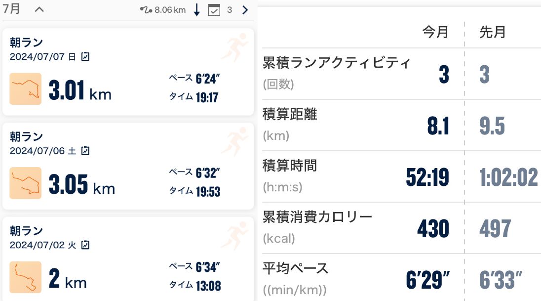 6月は、1ヶ月でたった3回しか走れなかったのだけれど、今月は、まだ7日目でそれに並んだことになる。
