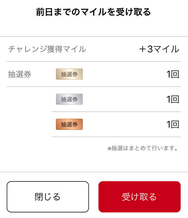 ベースの3マイルを獲得した後、3回抽選ができる仕組みだ。